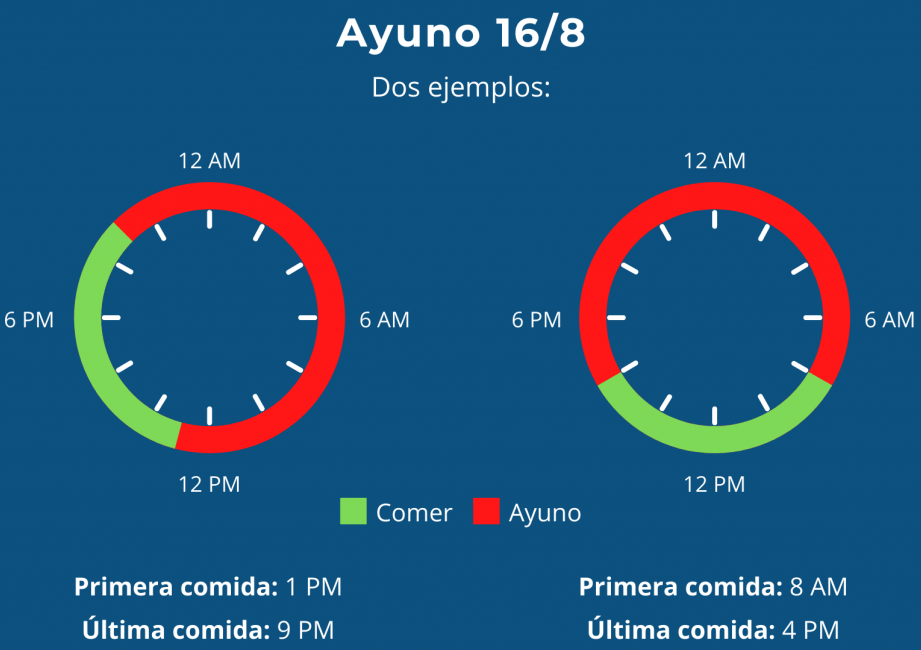 • 16/8: Este tipo de ayuno implica ayunar durante 16 horas al día y limitar la ventana de alimentación a 8 horas. Por ejemplo, puedes ayunar desde las 8 p.m. hasta las 12 p.m. del día siguiente y luego comer tus comidas dentro de las 8 horas restantes.